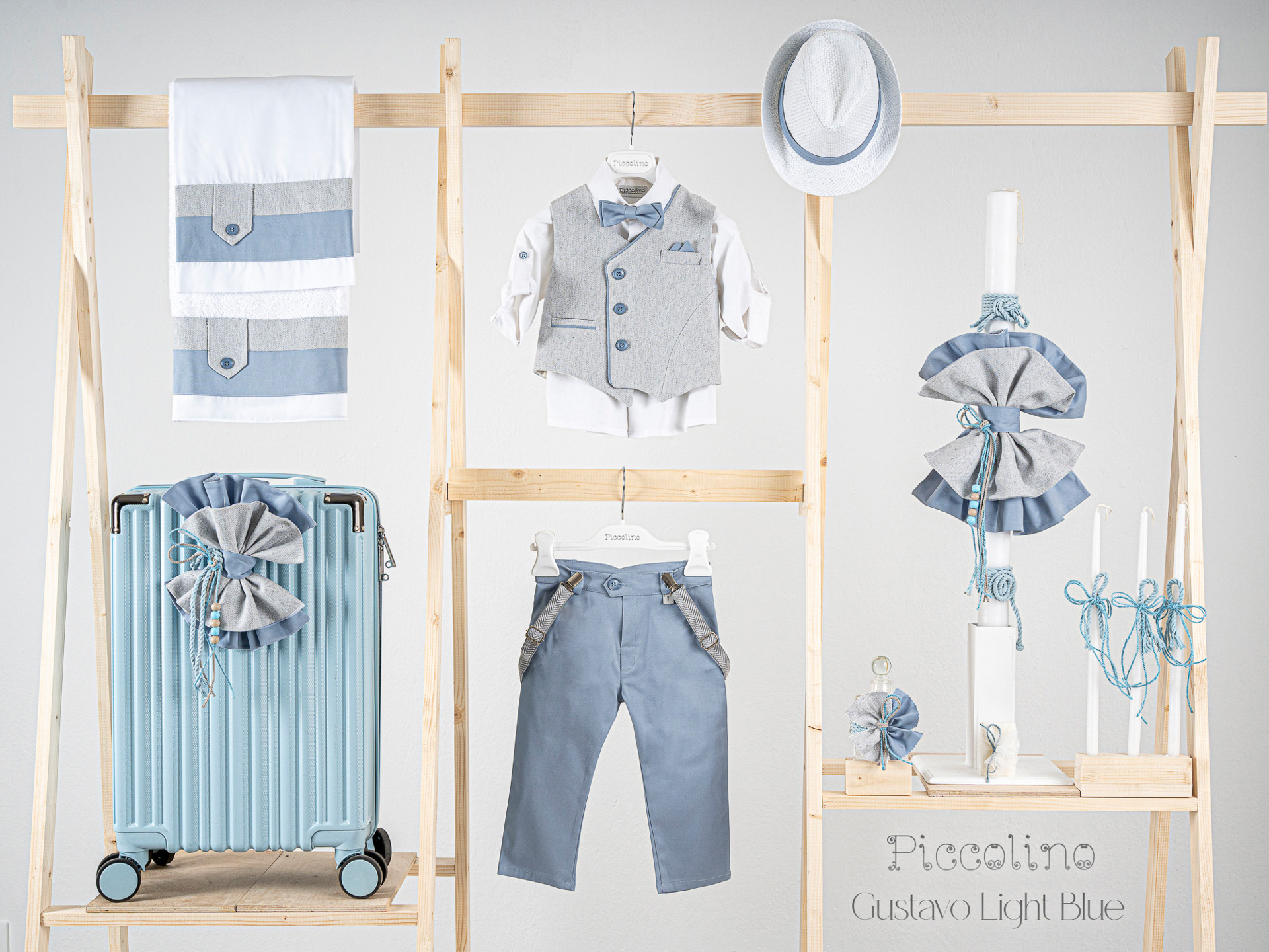 Βαπτιστικό πακέτο Piccolino Gustavo light blue περιλαμβάνει κοστούμι ,σετ λαδόπανα, λαμπάδα, λαδοσετ και στολισμένη βαλίτσα lightblue