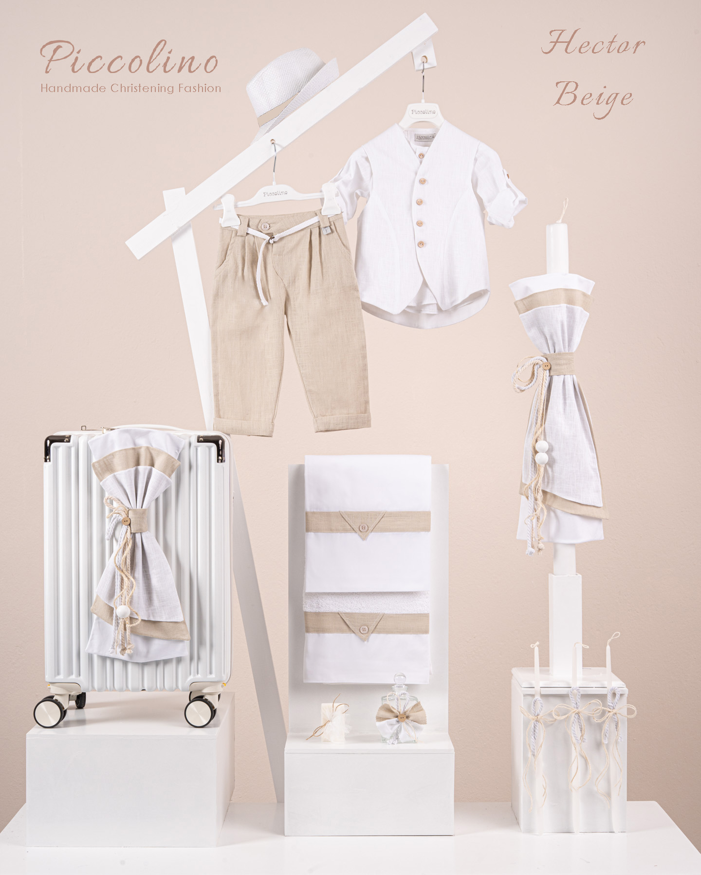 Βαπτιστικό πακέτο Piccolino Hector beige περιλαμβάνει κοστούμι ,σετ λαδόπανα, λαμπάδα, λαδοσετ και στολισμένη βαλίτσα white