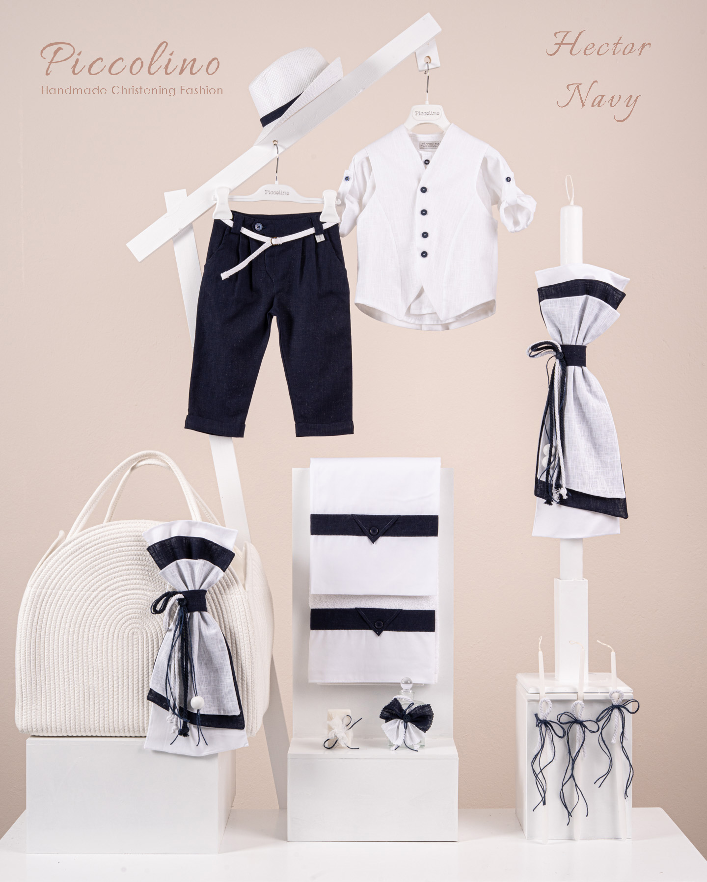 Βαπτιστικό πακέτο Piccolino Hector navy περιλαμβάνει κοστούμι ,σετ λαδόπανα, λαμπάδα, λαδοσετ και στολισμένη τσάντα ropes