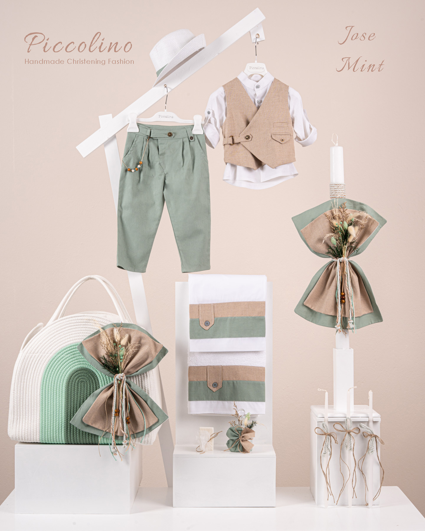 Βαπτιστικό πακέτο Piccolino Jose mint περιλαμβάνει κοστούμι ,σετ λαδόπανα, λαμπάδα, λαδοσετ και στολισμένη τσάντα ropes