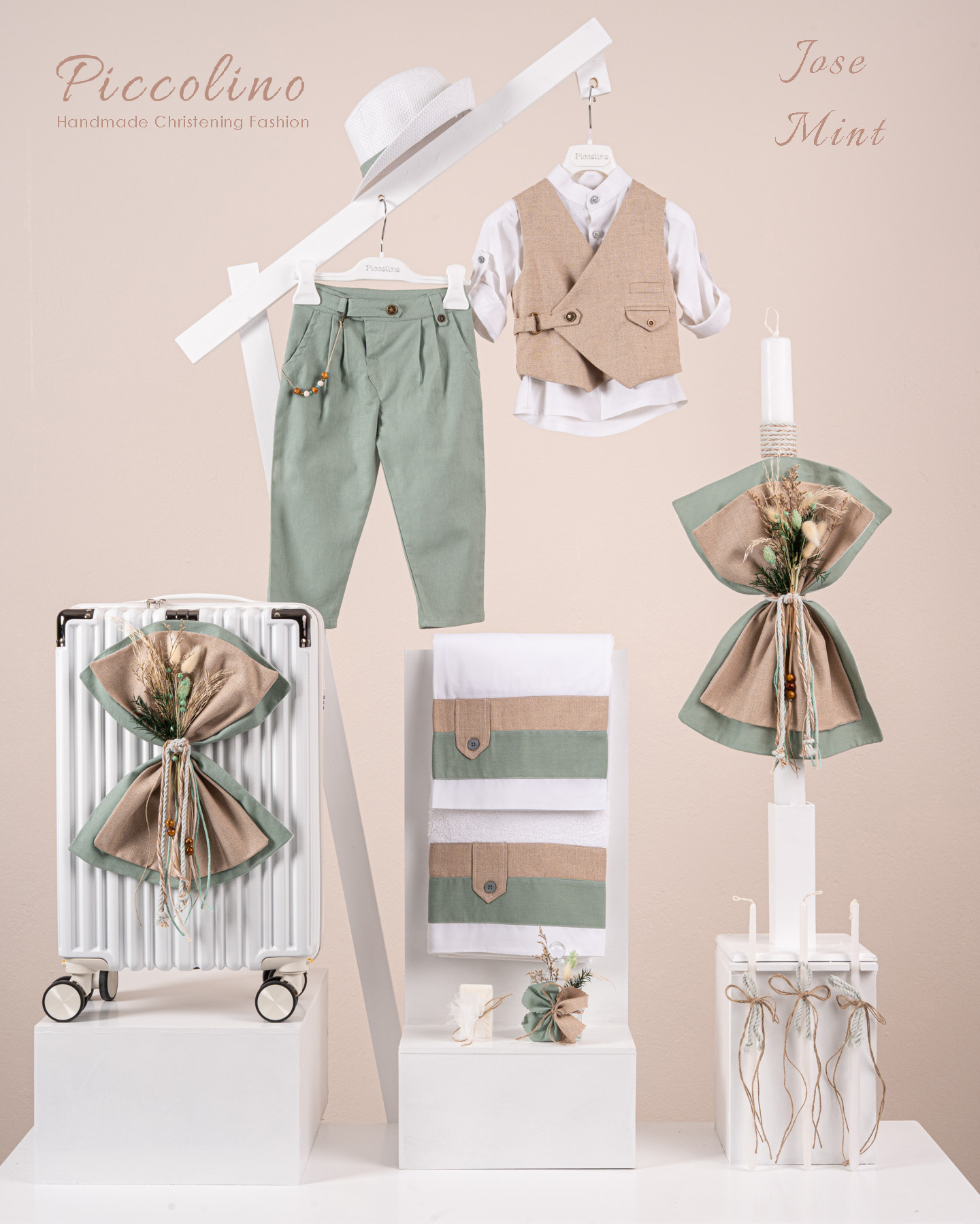 Βαπτιστικό πακέτο Piccolino Jose mint περιλαμβάνει κοστούμι ,σετ λαδόπανα, λαμπάδα, λαδοσετ και στολισμένη βαλίτσα white