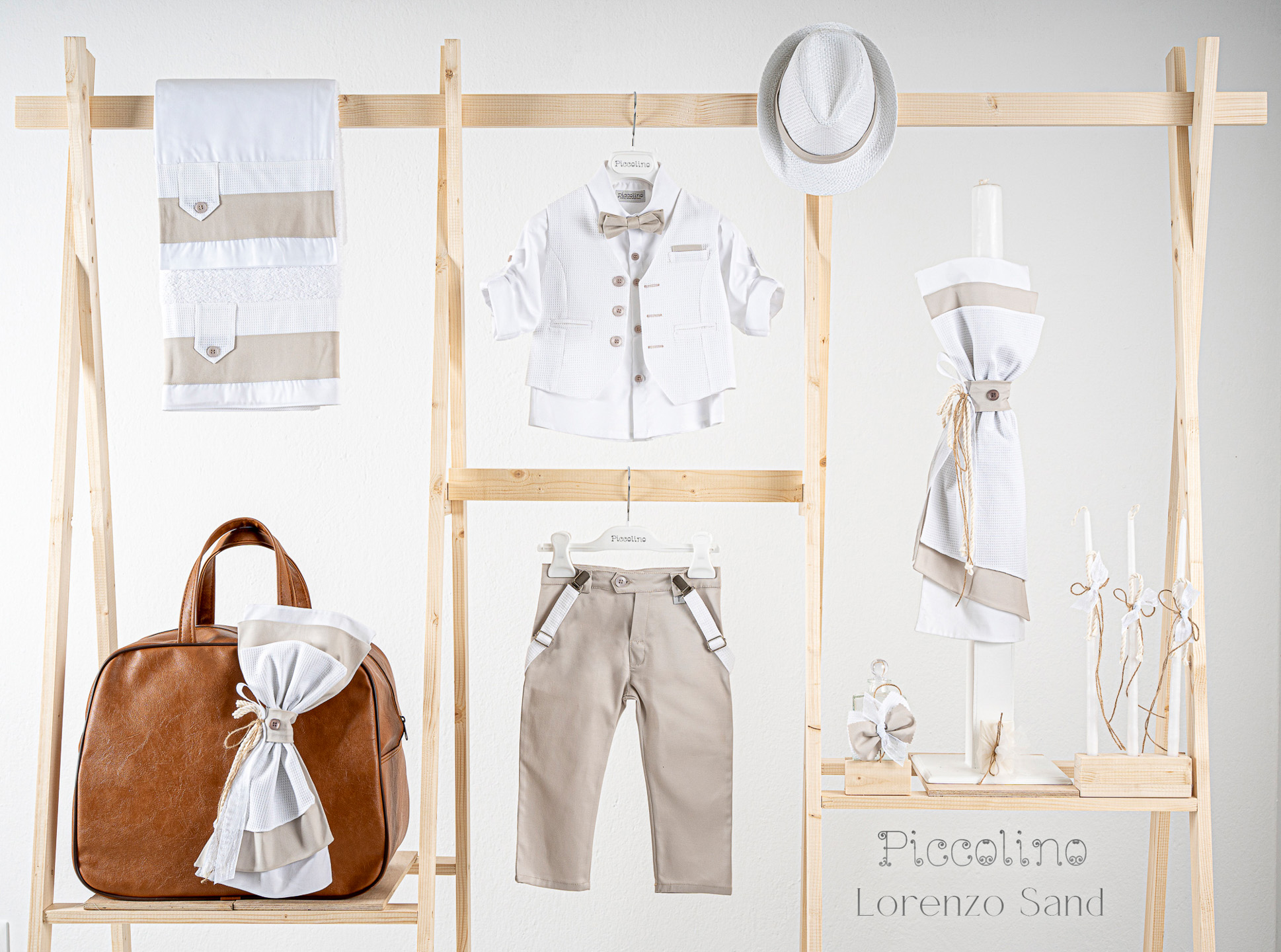 Βαπτιστικό πακέτο Piccolino Lorenzo sand περιλαμβάνει κοστούμι ,σετ λαδόπανα, λαμπάδα, λαδοσετ και στολισμένη τσάντα καφέ