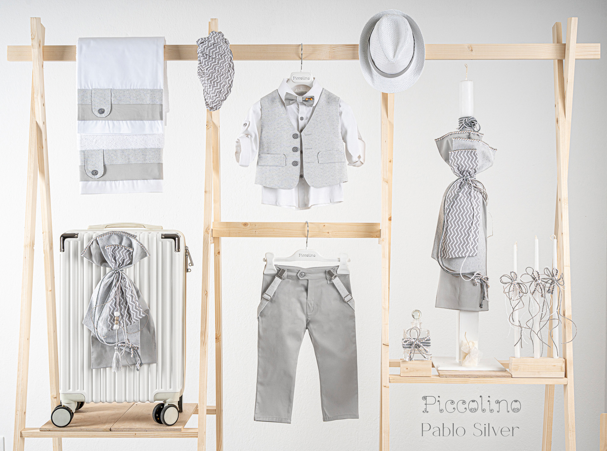 Βαπτιστικό πακέτο Piccolino Pablo silver περιλαμβάνει κοστούμι ,σετ λαδόπανα, λαμπάδα, λαδοσετ και στολισμένη βαλίτσα CREAM