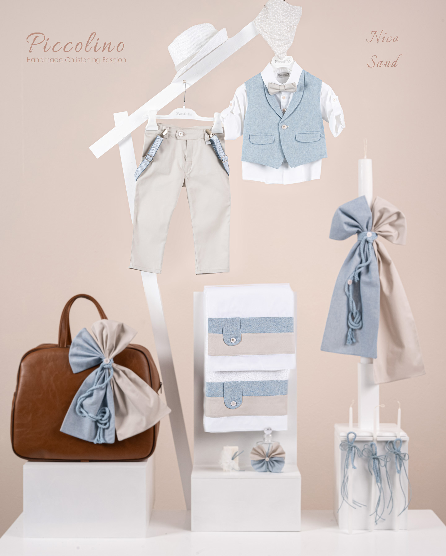 Βαπτιστικό πακέτο Piccolino Nico sand περιλαμβάνει κοστούμι ,σετ λαδόπανα, λαμπάδα, λαδοσετ και στολισμένη τσάντα καφέ