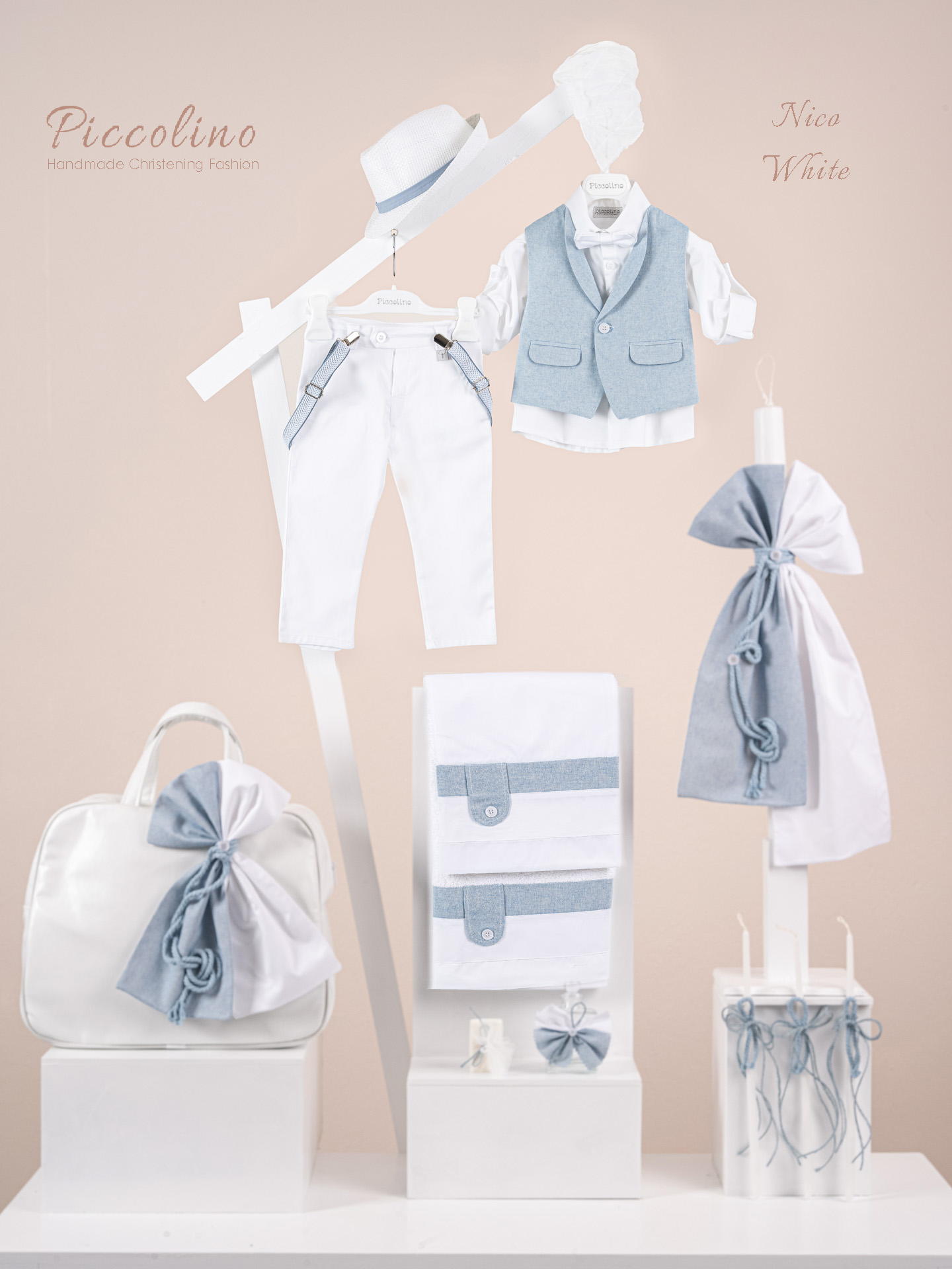 Βαπτιστικό πακέτο Piccolino Nico white περιλαμβάνει κοστούμι ,σετ λαδόπανα, λαμπάδα, λαδοσετ και στολισμένη τσάντα λευκή