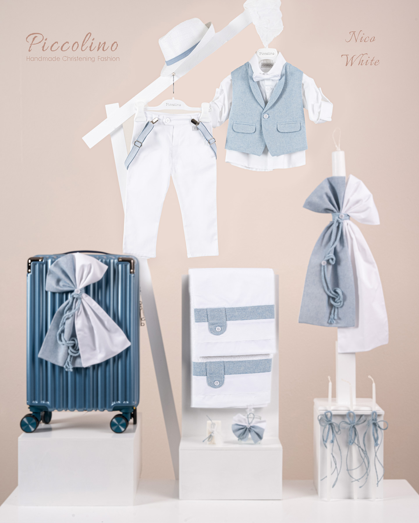 Βαπτιστικό πακέτο Piccolino Nico white περιλαμβάνει κοστούμι ,σετ λαδόπανα, λαμπάδα, λαδοσετ και στολισμένη βαλίτσα raf
