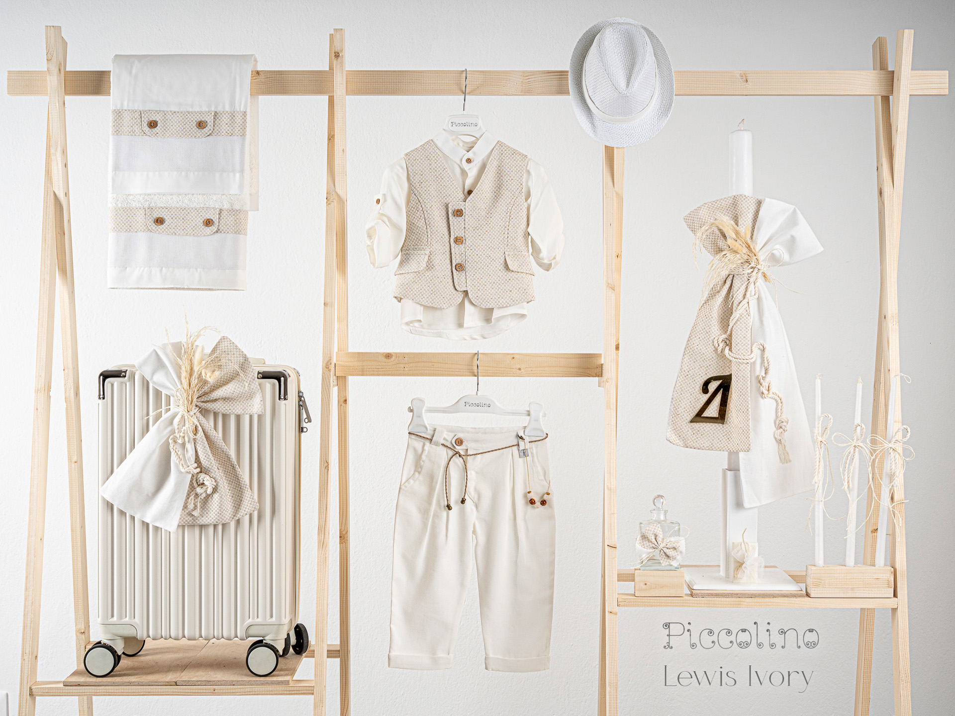 Βαπτιστικό πακέτο Piccolino lewis offwhite περιλαμβάνει κοστούμι ,σετ λαδόπανα, λαμπάδα, λαδοσετ και στολισμένη βαλίτσα CREAM